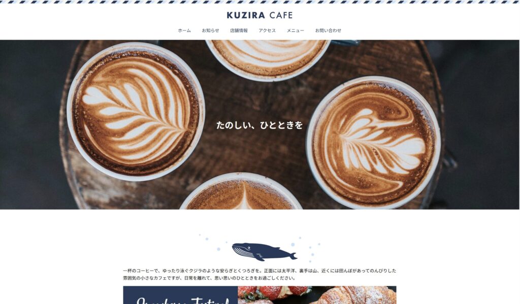 クジラカフェ サイトページ ページはこちら 職業訓練校課題。架空のカフェ「KUZIRA CAFE」のホームページを作成しました。HTML、CSSを学びながらサイト作成しました。 ターゲット カフェのお客様。20代から50代くらいまでの人。 目的 色を統一しまとまりのあるホームページにする。カフェのコンセプトを明確にし、新たな顧客アップにつなげる。 工夫した点 クジラカフェという名前なので、海やクジラをイメージし作成しました。タブレットやスマホでも見やすいようレスポンシブ対応のように作成しました。 制作期間 ・1か月 使用ツール ・VScode